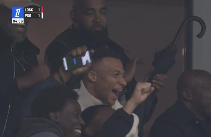 埃唐-姆巴佩绝平巴黎后模仿哥哥庆祝,姆巴佩在看台喜笑颜开